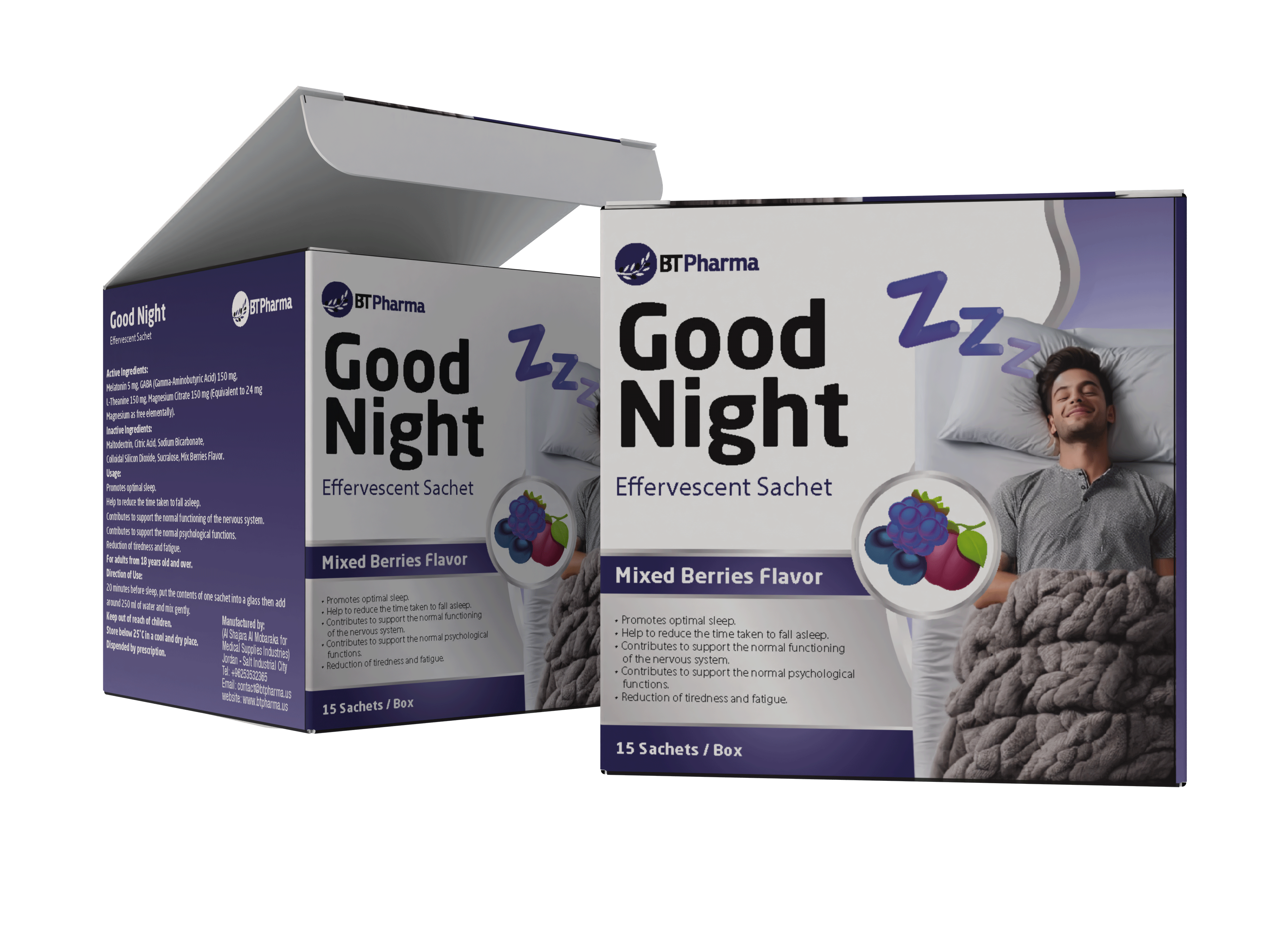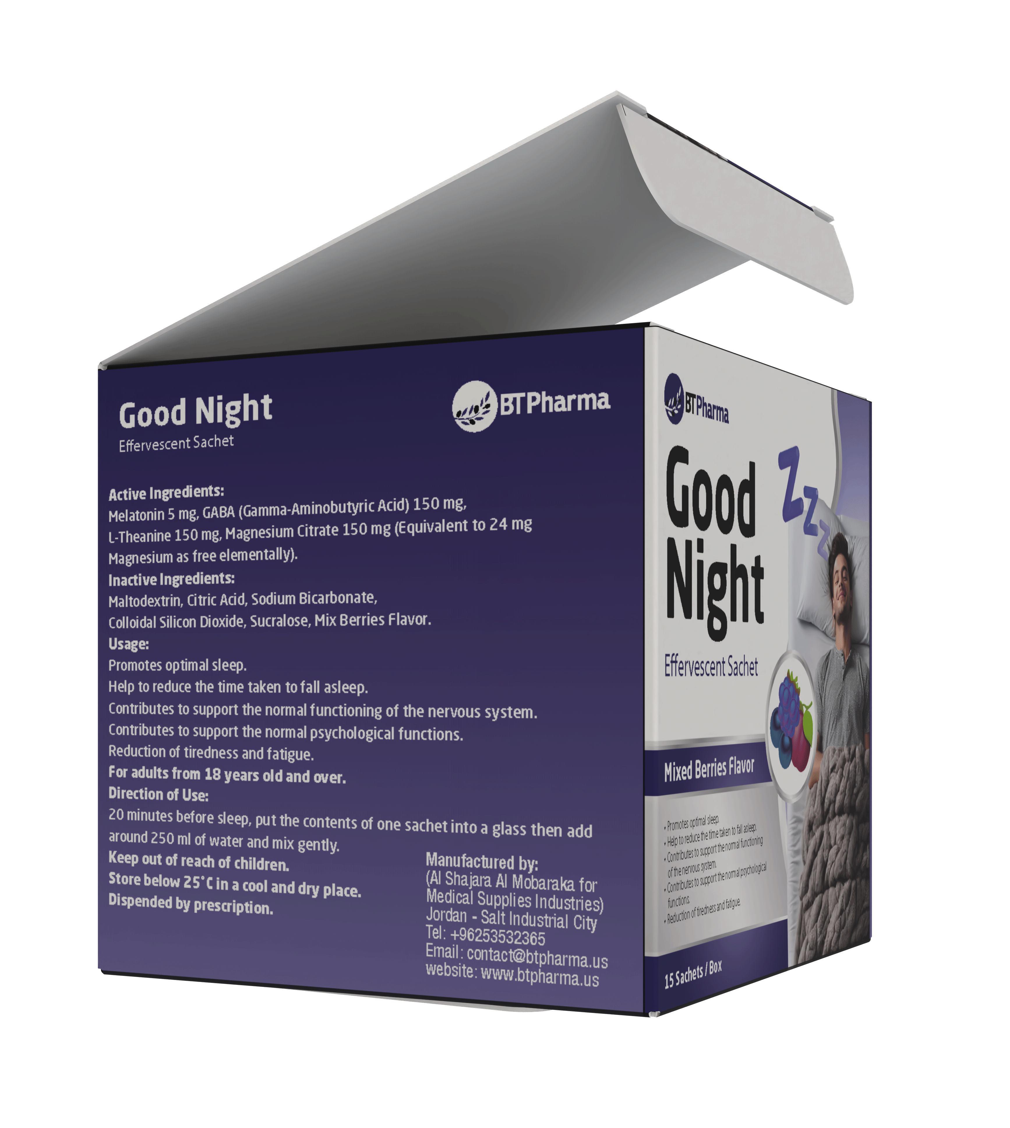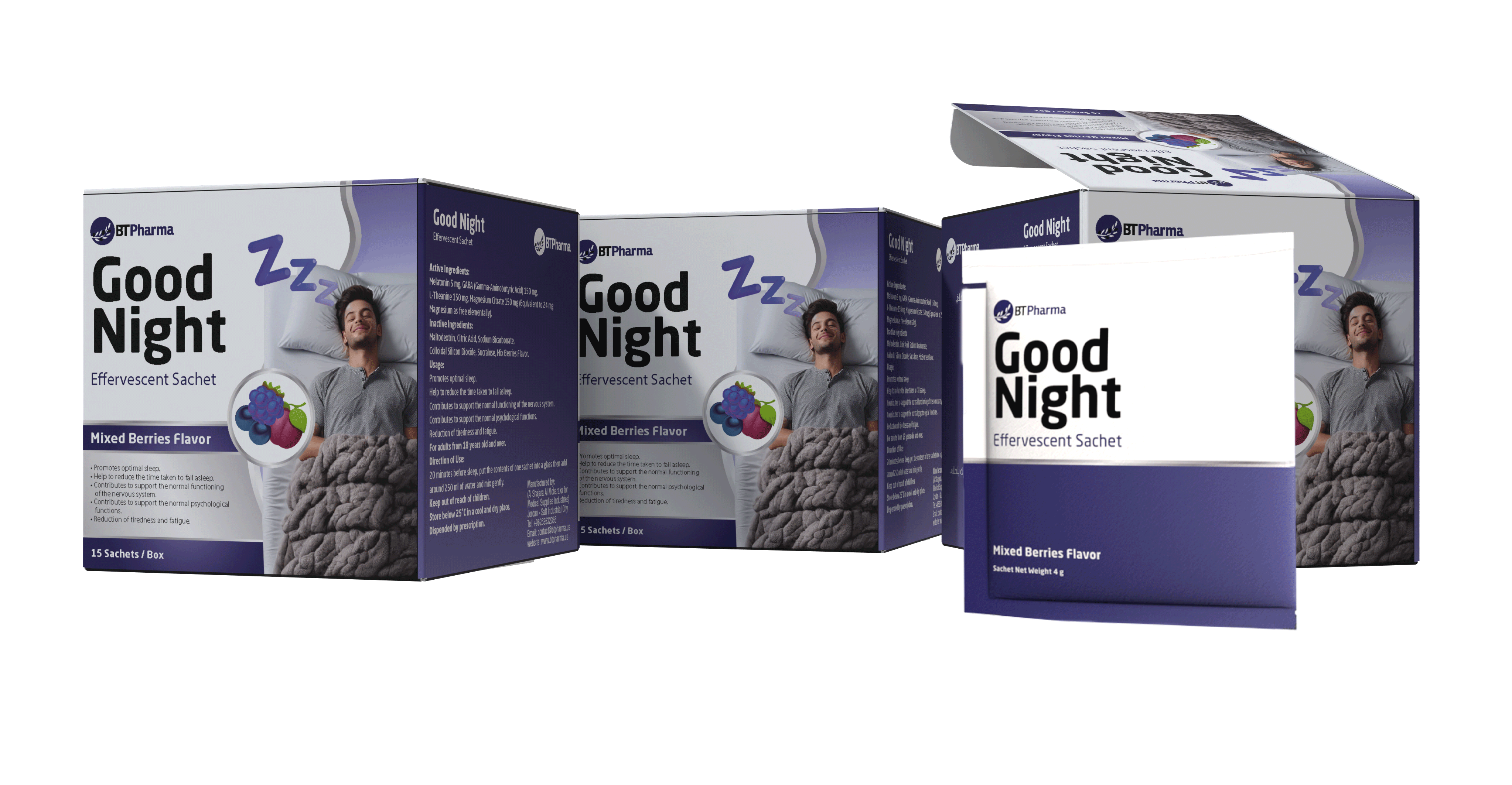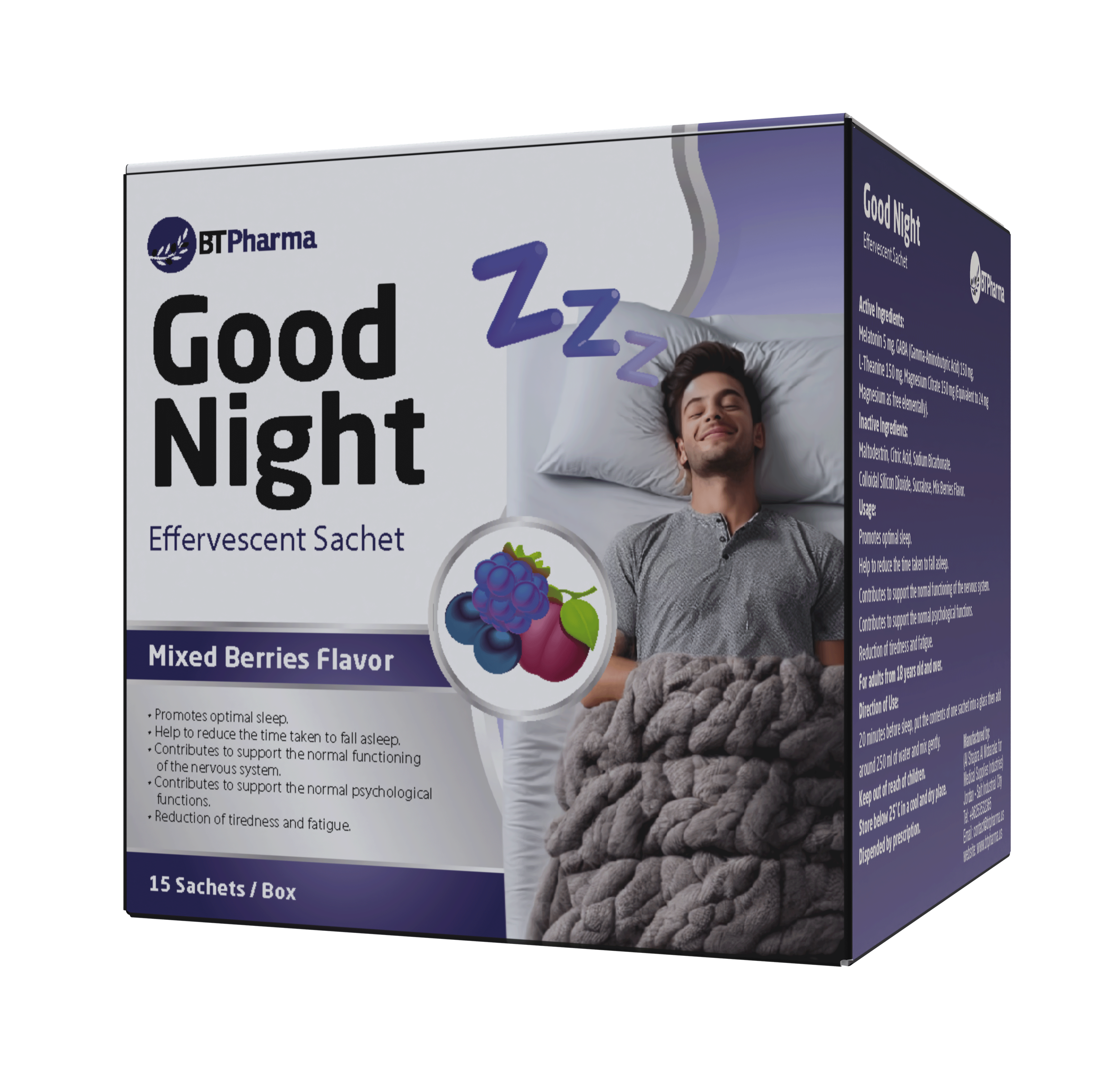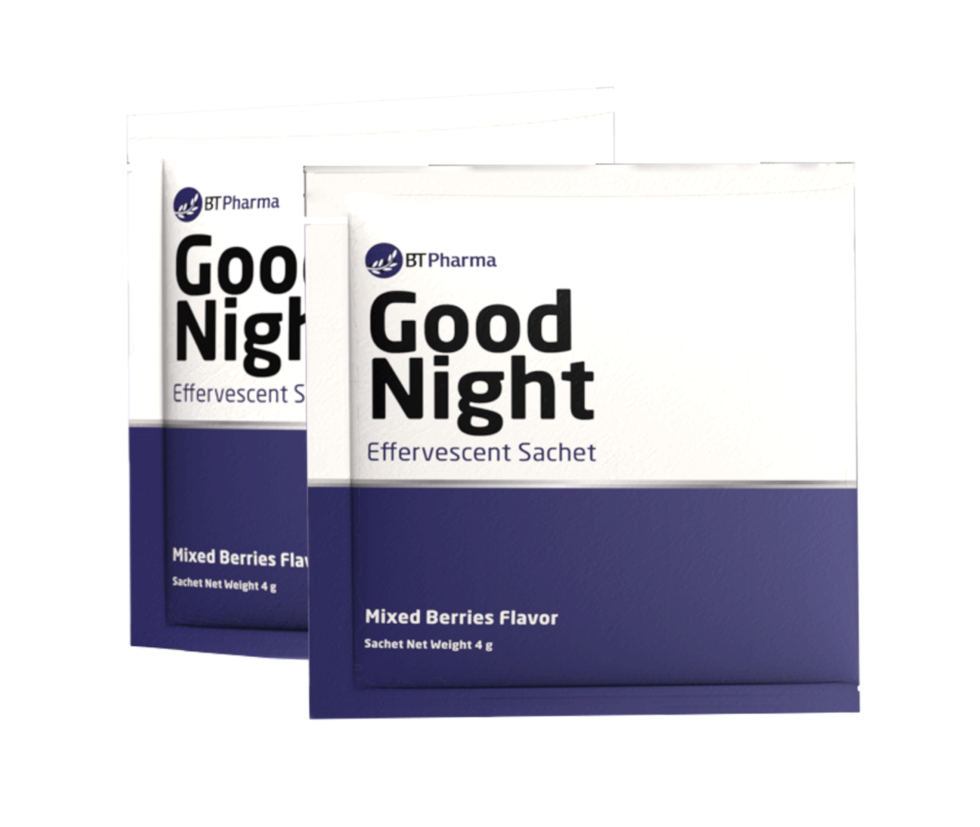 BTPharma Good Night® Effervescent Sachet is a scientifically formulated dietary supplement that combines melatonin, GABA, L-theanine, and magnesium citrate to support faster sleep onset, better sleep continuity, and healthy nervous system function.