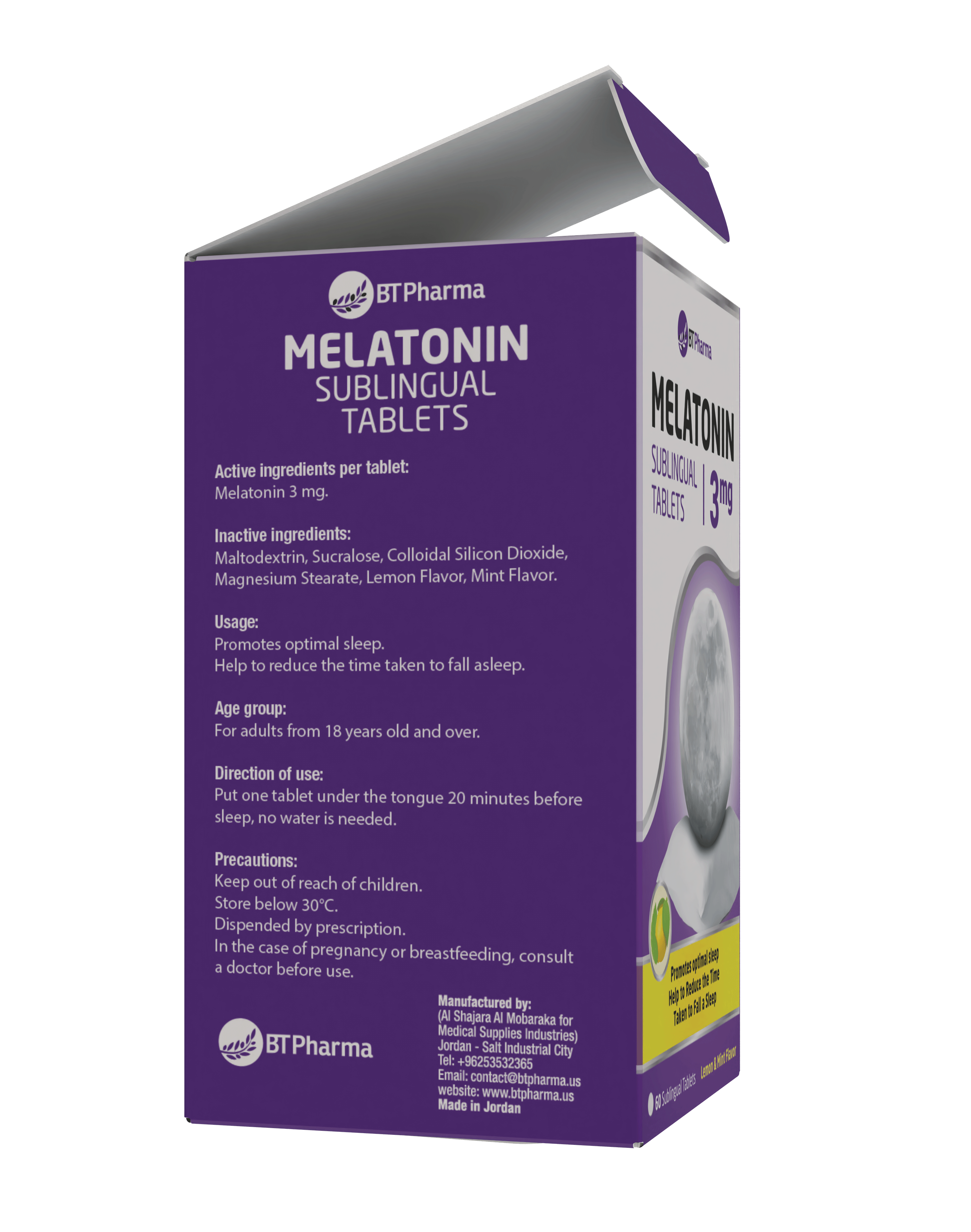 BTPharma Melatonin Sublingual Tablets are pharmaceutical-grade, fast-dissolving oral supplements designed to support natural sleep onset and improve overall sleep quality. Melatonin is the body’s natural sleep hormone, produced by the pineal gland, and plays a key role in regulating the sleep–wake cycle.